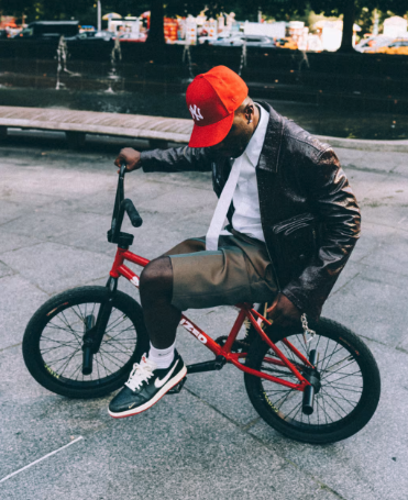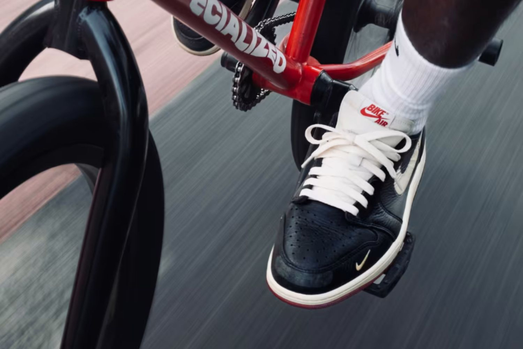 The upper arrives in a rugged mix of Black, Muslin, and Varsity Red, with scuffing across the premium leather, signalling an intentional nod to Sylvester’s BMX background. A sail-coloured Swoosh adds contrast, while red ‘Bike Air’ branding hits the tongue and insole.